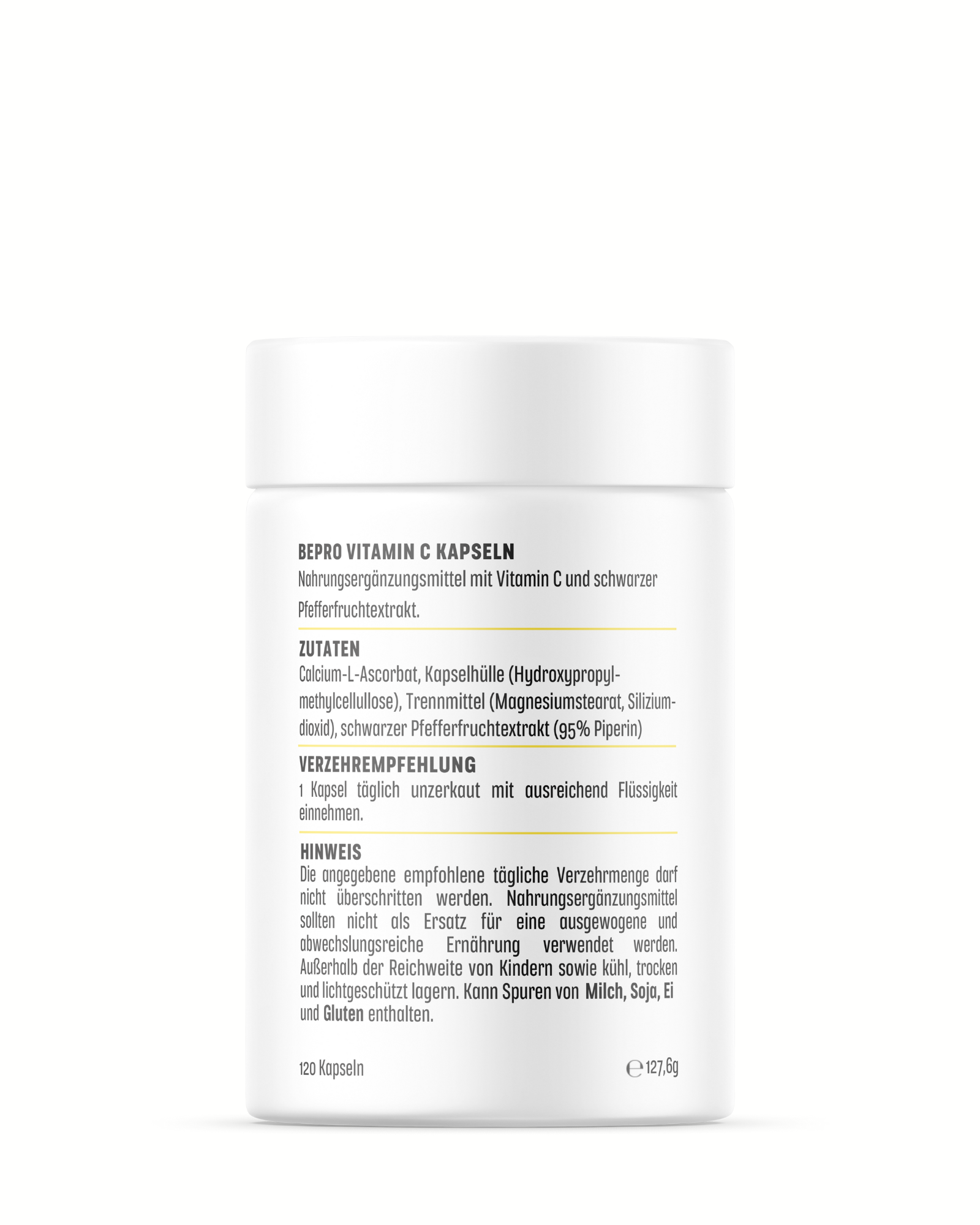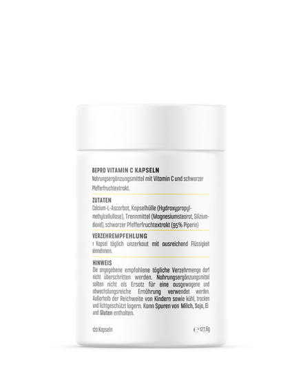 Darüber hinaus unterstützt Vitamin C den Energiestoffwechsel³ und trägt zur Verringerung von Müdigkeit und Ermüdung bei⁴. Es leistet einen Beitrag zur normalen Funktion des Nervensystems⁵ sowie zur normalen psychischen Funktion⁶. Zusätzlich unterstützt Vitamin C die normale Kollagenbildung und damit die Funktion von unserer Haut⁷. Eine durchdachte Ergänzung für Alltag, Training und intensive Belastungsphasen⁸.